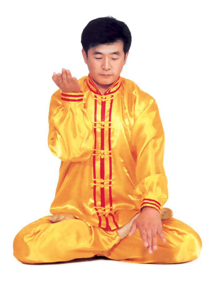 Tu luyện tĩnh công: Tiếp theo tư thế trên, sau đó, tay trên vạch một nửa hình tròn ra phía trước và rơi vào chỗ bụng dưới, hai tay trở thành trạng thái kết ấn (như hình 5.15), tiến nhập vào tu luyện tĩnh công. Nhập định, thời gian càng lâu càng tốt.